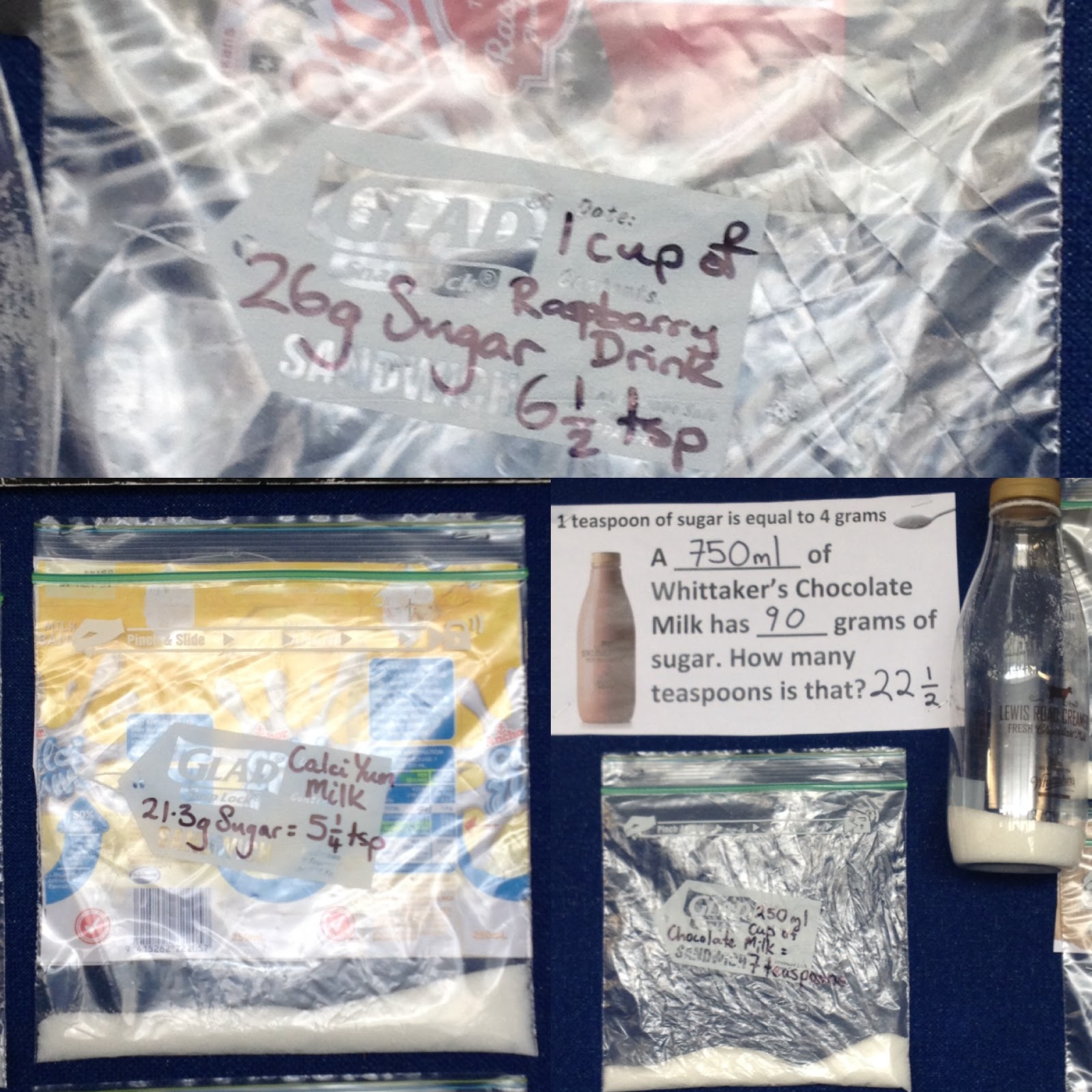 Once we solved the problem we measured the sugar out into a clear bags so we could all see, just how much sugar is in the food we eat.